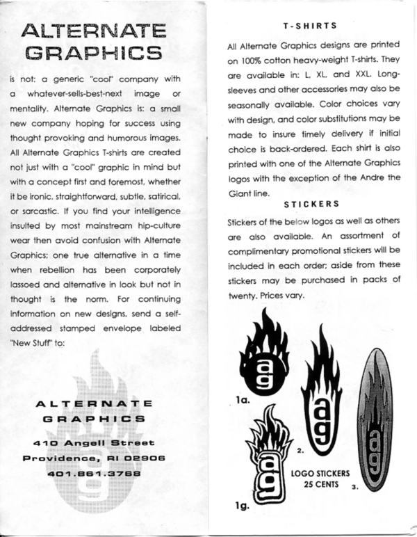 In 1992, while still an illustration student at RISD, Shepard Fairey started his first business venture, Alternate Graphics, to showcase his emerging design and silkscreen printing talents. He created stickers, t-shirts, skateboards, and posters which were all available via black and white mail order catalogs that he distributed. He also did small commercial printing jobs for clients to help cover some of his expenses. In 1994, Helen Stickler created a documentary film, Andre the Giant Has a Posse, that focused on Fairey and the growing phenomenon of his subversive stickers and posters. By 1995, Fairey had two or three full time employees, two of whom were long time friends from Charleston, whom he had known through his many years of skateboarding. During this time, he also created a small sister brand, Subliminal Projects, with Blaize Blouin, and released several skateboard and poster designs using this moniker. Fairey created a skateboard video, ADD (Attention Deficit Disorder), that showcased the small group of skateboarders that he sponsored via Alternate Graphics.