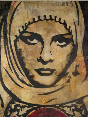 In subsequent posts, Filipow followed up with a series of pictures of the in-progress Basel Canvas. He also reported that there were no immediate plans to make a print edition of the image. Later (11/26/2006), Filipow reported that Obey will release a print based on the Basel Canvas (aka Arab Woman). It was a two-color, vertical format screenprint and was made available in December 2006. More details on the print can be found here: Arab Woman. A second version of this print, called Arab Woman Gold was also released on ObeyGiant.com.