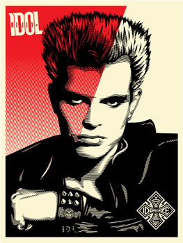 Check out that peroxided spiky hair do… no, it’s not one of the millions of copy cats spawned by the White Wedding video, it is the real BILLY IDOL. Our resident photographer shot lots of photos of us signing prints and hanging out, but then bailed for Mexico with the photos on his laptop. Now that’s what I call a BOLD STRATEGY! Anyway, I did the album package for Billy’s greatest hits album and a screen printed poster to go along with it. The prints are signed by me and Billy. The edition is 400. They are $50. Billy’s album Idolize Yourself comes out June 24. It contains all the classics plus some good new songs. The new wave meets propaganda package alone makes it worth picking up. I also got to interview Billy and we may put some of that up on YOUTUBE. Stay tuned. -Shepard