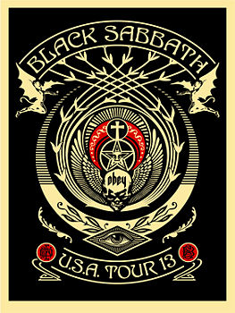 Black Sabbath has been one of my favorite bands for 25 years. I was fortunate enough to meet Jack Osbourne through my friend Big Dave in 2000. My relationship with Jack and Big Dave has led to several great Ozzy and Sabbath projects over the years. One of my biggest “I’m not worthy!” moments took place when Dave took me backstage to meet the Sabbath guys in 2004 at Ozzfest and bassist and lyricist Geezer Butler was wearing an Obey shirt! Sabbath is still a phenomenal live band and I’m incredibly honored to do my second(first was in 2005) Sabbath/Obey tour poster. Sabbath released a great new record called “13″ recently(produced by Rick Rubin) and are touring in support of the album. There are 125 of each poster in each color way, black and red, and black and metallic silver. -Shepard
