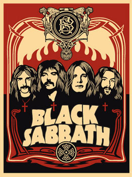 I’ve been a fan of Black Sabbath for a very long time. Coincidentally, a friend of mine happens to work for Ozzy, and has planted a lot of my art in the Ozzy camp, whether simply showing it to Sharon and Ozzy or getting Jack to wear Obey shirts on the TV show. In 2004, they asked me to make the VIP band and crew shirts, which said “Black Sabbath has a Posse,” with each member of the band in the original Andre sticker format. This piece here is from the poster and T-shirt I designed for Sabbath’s 2005 tour.