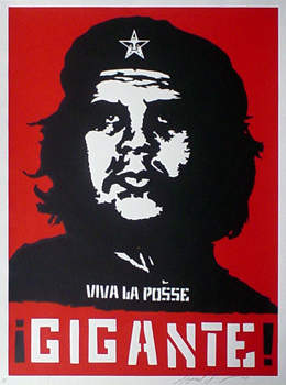 The Che Guevara photo, taken by Alberto Korda in 1960, is probably the most clichéd image of rebellion worldwide. I stole it not so much to endorse what Che was about or what he did, but to demonstrate that symbols become easy to manipulate after they have a life beyond their real history. I see lots of kids with Che t-shirts who probably know nothing about him besides his rebel status. I tried to capture some of the essence of the original Che photograph, but it’s clearly not Che’s face – it’s Andre the Giant’s face. After this picture sat in the window of a San Diego art gallery for three months, a clerk across the street pointed at my Andre icon face t-shirt and exclaimed, “Che Guevara! I too am a fan of Che Guevara.” It just shows how people’s memory can be reconditioned through imagery. (Note: This quote refers to the original 1997 release of this print.)