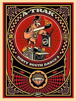 This print was only available for purchase through 80s Purple and was not sold on Obeygiant.com. The print was sold as part of a set with A-trak's Dirty South Dance 2 CD, featuring Shepard Fairey-designed cover art, for $55. A "deluxe pack" was also available--which included the print, CD, and a t-shirt that featured the print artwork--for $80. The print is signed by both Shepard and DJ A-trak.