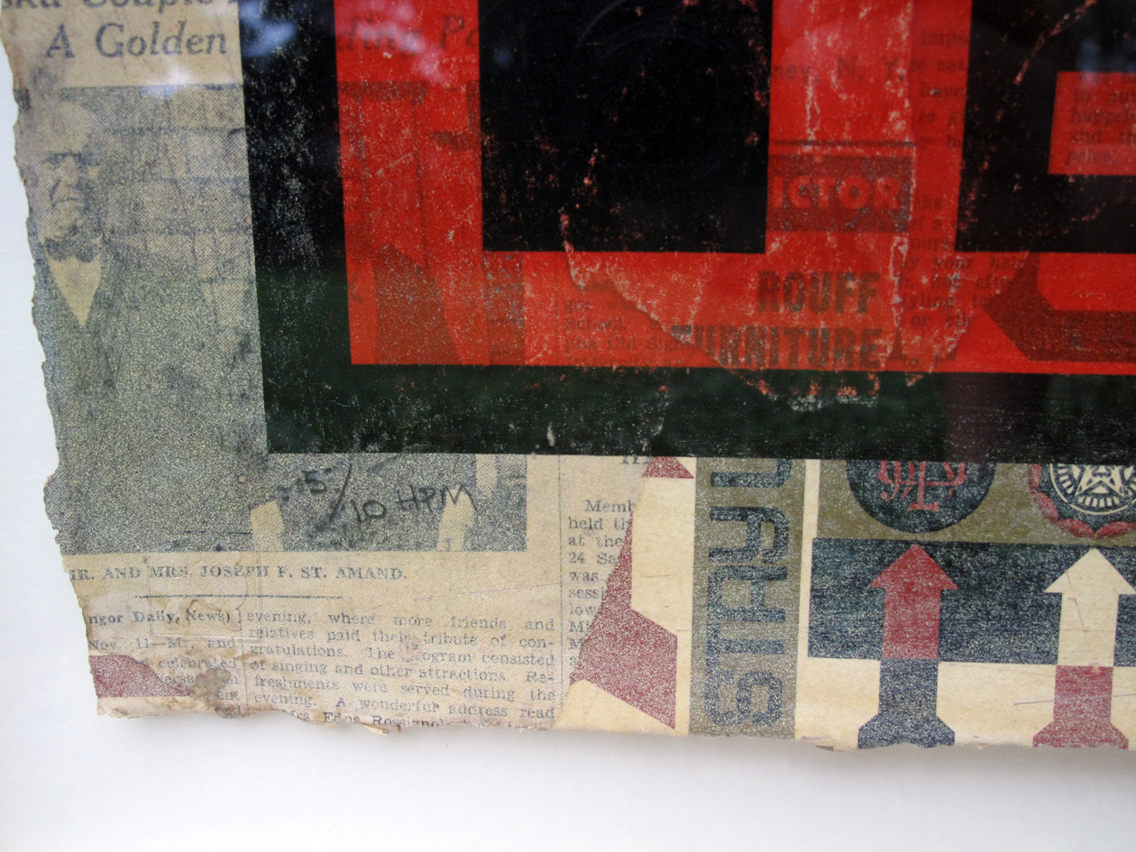 (Shepard Fairey, Behind You (from 20 Year Anniversary Retro Series), January 2009. Painted Multiple (HPM), Serigraph and Unique Mixed Media Hand-Collage on paper. 29 x 42 inches. HPM edition of 10. Studio chop lower left, signed lower right. )