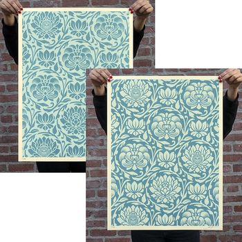 Floral Harmony. Silkscreen on cream Speckle Tone Paper. 18 x 24 inches. Signed by Shepard Fairey. Numbered edition of 100. Limited quantities of the FULL set (all eight prints) will be sold at a discounted price of $280. PAIRS of each colorway will be sold for $90: Dark Blue Yin/Yang, Light Blue Yin/Yang, Black Yin/Yang, Red Yin/Yang. Available on Tuesday, February 4th @ 10AM PDT at store.obeygiant.com/collections/prints. Max order: 1 of each set per customer/household. *Orders are not guaranteed as demand is high and inventory is limited.* Multiple orders will be refunded. International customers are responsible for import fees due upon delivery. ALL SALES FINAL.