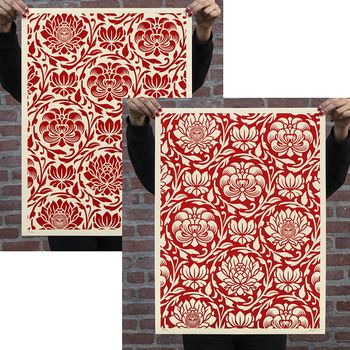 Floral Harmony. Silkscreen on cream Speckle Tone Paper. 18 x 24 inches. Signed by Shepard Fairey. Numbered edition of 100. Limited quantities of the FULL set (all eight prints) will be sold at a discounted price of $280. PAIRS of each colorway will be sold for $90: Dark Blue Yin/Yang, Light Blue Yin/Yang, Black Yin/Yang, Red Yin/Yang. Available on Tuesday, February 4th @ 10AM PDT at store.obeygiant.com/collections/prints. Max order: 1 of each set per customer/household. *Orders are not guaranteed as demand is high and inventory is limited.* Multiple orders will be refunded. International customers are responsible for import fees due upon delivery. ALL SALES FINAL.