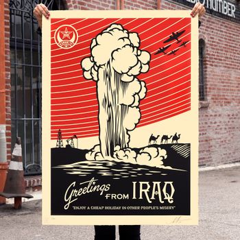 Greetings From Iraq. Serigraph on Coventry Rag, 100% Cotton Custom Archival Paper with hand-deckled edges. 30 x 41 inches. Signed by Shepard Fairey. Numbered edition of 89. Comes with a certificate of authenticity. $900. Available Tuesday, September 10th @ 10 AM PDT at store.obeygiant.com/collections/prints. Max order: 1 per customer/household. *Orders are not guaranteed as demand is high and inventory is limited.* Multiple orders will be refunded. International customers are responsible for import fees due upon delivery. ALL SALES FINAL.