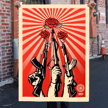 Guns and Roses. Serigraph on Coventry Rag, 100% Cotton Custom Archival Paper with hand-deckled edges. 30 x 41 inches. Signed by Shepard Fairey. Numbered edition of 89. Comes with a certificate of authenticity. $900. Available Tuesday, August 27th @ 10 AM PDT at store.obeygiant.com/collections/prints. Max order: 1 per customer/household. *Orders are not guaranteed as demand is high and inventory is limited.* Multiple orders will be refunded. International customers are responsible for import fees due upon delivery. ALL SALES FINAL.