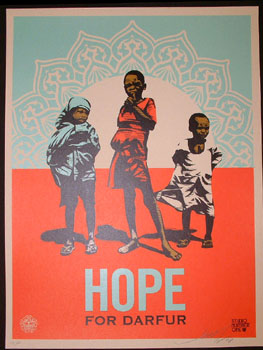 HOPE (Helping Other People Everywhere) Artists is an energy conscious humanitarian organization focused on supporting existing social projects that promote education and growth. HOPE commissioned Studio Number One to do a series of screen prints to raise awareness and funds for the humanitarian efforts in Darfur. The poster series focuses on the future of Darfur, through the faces of its children. The series is an edition of 300 signed by each of the artists. Posters were designed by: Shepard Fairey, Florencio Zavala, Jesselisa Moretti, Cleon Peterson, Zach Gibson, Casey Ryder and Kristian Henson.