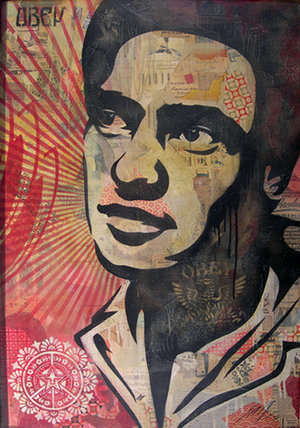 At Shepard's 2006 show at White Walls Gallery in San Francisco, he debuted a collage tribute to Huey Newton. Priced at $6000.00, the collage came with the original rubylith and stencil so that the image could never be reproduced.