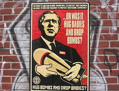 Hug Bombs Paster Version was an unsigned, unnumbered offset poster on thin paper. Copies of this poster, along with stickers, were distributed to members of the 'street team' in the run-up to the 2004 presidential election. Shepard also released both screen print and offset lithograph versions of this poster (Hug Bombs and Hug Bombs Offset, respectively).