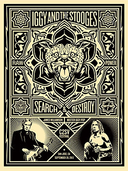 The Stooges poster is an edition of 450 and comes out Sept. 26 on obeygiant.com where 250 will be available. with the other 200 available on site at the C2SV Festival. My friend Robert Matheu shot the portrait of James Williamson and Jennifer Anderson took the Iggy photo. -Shepard