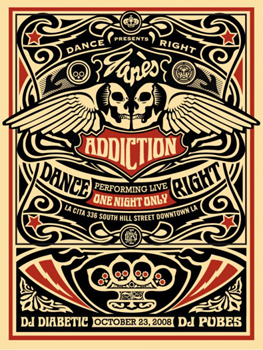 A couple of weeks ago, Jane’s Addiction played a secret show at a bar we regularly host on Thursdays, called LA CITA. The show was great and Jane sounded credible. Here are a couple of prints that Shepard and Matt Goldman (MFG /Dance Right) did for the night and the band. Shepard’s print is an Edition of 450 and MFG’s print is an edition of 400, both are $45 each.