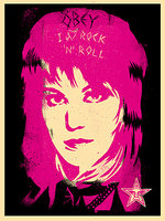 In 2002, Joan Jett was given the Obey treatment, as Shepard released Joan Jett Pop and Joan Jett Pink, both based on the cover to the #1 hit single "I Love Rock N' Roll," released in 1982 by Joan Jett and the Blackhearts.