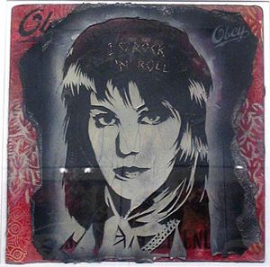 Related Fine Art Pieces: Joan Jett Album Cover HPM - Joan Jett on Metal - Joan Jett Retired Stencil on Paper - Joan Jett Stencil Collage on Album Covers - Joan Jett Stencil on Album Cover