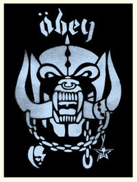 Joe Petagno's design of Snaggletooth for Motorhead's 1977 self-titled debut album was the model for Fairey's 2002 prints Motorhead Red and Motorhead Silver.