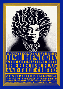 Shrine Auditorium, Los Angeles, 1968 promotional poster, one of the best Hendrix posters ever designed. The Pinnacle Concert Production Company mounted many many important concerts here in the 1960's. As the artist behind many of these posters John Van Hamersveld earned himself a reputation that spread far beyond Southern California. This particular piece for the "Jimi Hendrix & Soft Machine with The Electric Flag and Blue Cheer" concert is a classic. The simplicity of design and restrained use of color were just right...
