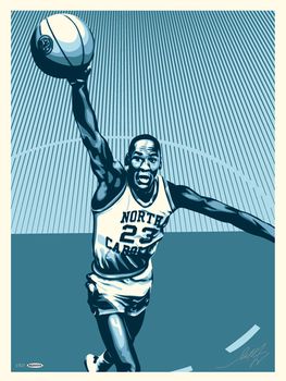 This print is signed by Shepard Fairey only. It was available either as part of a three-print set with the two other Jordan prints or individually. The set retailed for $215.99 and the individual print was priced at $79.99. Both the set and individual print were available exclusively from the Upper Deck Store.