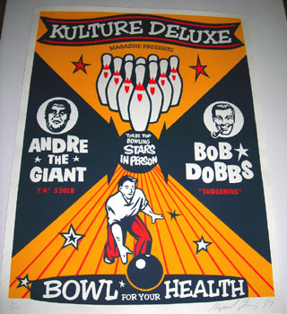 Shepard personally hand pulled all of these prints in 1997 for his friend Rex Darling, publisher of the wildly popular, but short lived San Diego magazine Kulture Deluxe. The run size is the combined total for all 5 different variations of this print. It is thought that only 10 or fewer copies of this particular version (red stars, red on pins, white circles around Andre and Bob Dobbs, red pants on bowler) were printed. The image was based on the cover of the program for Winter Dance Party. For more information see Bob Dobbs.