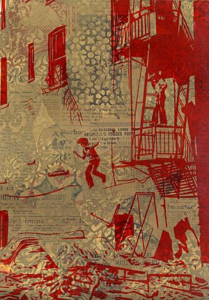 This piece retailed for $2100 at The Duality of Humanity. At that show, it was titled "Street Play Rubylith." Subsequently, the name was changed to Leap of Faith for the print release. The image is based off of the work of Martha Cooper.