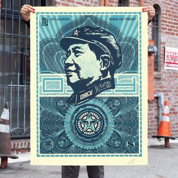 In 2003, Fairey dissected the graphic design of instruments of wealth and power such as currency, stamps, and stock certificates, resulting in a series of works about the intersection of economic wealth and political power. The minting of new currency featuring the portrait of the leader is an act characteristic of totalitarian regime. The numbered portraits of the infamous leaders 1) Lenin, 2) Mao, and 3) Nixon are surrounded by design elements commonly used for such documents, including ornate patterns and intricate motifs incorporated to confound counterfeiters. The artist inserts his own imagery including the Obey Star Icon and the word “Obey” into the composition. “In lesser gods we trust,” is a recurring phrase used by the artist. It is an alteration of “In God we trust” phrase used by the artist. It is an alteration of “In God we trust” found on the back of all US currency, signaling the contradicting term given that the separation of church and state is a founding principle of the constitution. Fairey’s use of the term refers to the process of deification of powerful leaders and the corresponding betrayal of public trust through corruption and abuse of power.