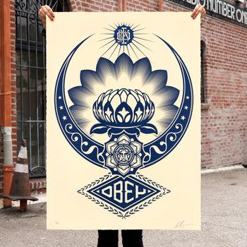 OBEY Lotus Ornament. Serigraph on Coventry Rag, 100% Cotton Custom Archival Paper with hand-deckled edges. 30 x 41 inches. Signed by Shepard Fairey. Numbered edition of 89. $900. Comes with a certificate of authenticity. Available Tuesday, July 23rd @ 10 AM PDT at store.obeygiant.com/collections/prints. Max order: 1 per customer/household. *Orders are not guaranteed as demand is high and inventory is limited.* Multiple orders will be refunded. International customers are responsible for import fees due upon delivery. ALL SALES FINAL.