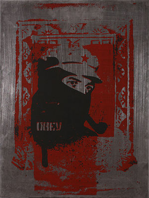 Related Fine Art Pieces: Dalek and Shepard Fairey - Marcos Stencil - Marcos Collage HPM on Paper - Marcos Profile Retired Stencil - Marcos Profile Stencil Collage on Album Cover - Marcos Stencil on Metal