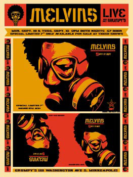Only a few in this run were numbered. It was previously thought that all prints in the run were signed, but a few unsigned copies have popped up (also unnumbered). For more information on the band, see Melvins Music. The image of King Buzzo from the Melvins is reused in the 2001 print Visual Pollution Gas Mask.