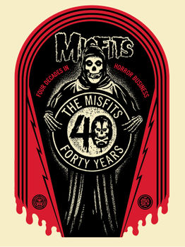 The Misfits are a punk rock revelation and a band that have mesmerized me from my first introduction to them in 1985. Being asked to do a Misfits 40th anniversary logo recently was a huge honor, and that art is still available as a t-shirt now on the band’s websites – MisfitsOfficialMerch.com and MisfitsRecordsOfficial.com. I’m also very excited that the art is going to be dropping next week as two different variations of fine art screen prints. The Misfits art is pure alchemy genius and the best example of remixing marginal subculture imagery into a cohesive cult brand in history. From horror films, comics, serials, and B-movies the Misfits culled, cut, pasted, inked, and crafted possibly the most recognizable and enduring punk iconography ever. The thing that I love about the classic Misfits imagery is that it is well designed, but has a do-it-yourself charm that is organic and unfussy. I tried to channel this history through my artistic sensibility in the 40th logo and poster. We’re releasing two versions of this print – a “Grave” edition and a “Crypt” edition. The Grave edition will be available on my website ObeyGiant.com on Tuesday, May 30th at 10AM (PDT) and the “Crypt” edition will be available on the Misfits stores – MisfitsOfficialMerch.com and MisfitsRecordsOfficial.com. I’ll be seeing you again! – Shepard