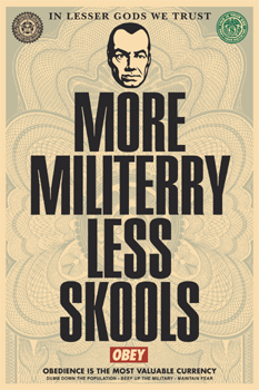 "...”more militery - less skools” where military and schools are misspelled suggesting that we need to be - especially in the US - investing more in the future with people’s education... and global domination." -Shepard