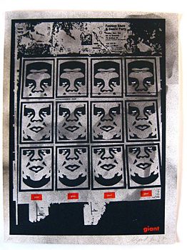 "This print is oversprayed with glossy black spray paint, not undersprayed with matte metallic silver a'la Knitting Factory. The spray on top of the screen print gives it a bit of iridescence. There is another extraordinary detail: the whites of Andre's eyes are painted in with white-out, making this one of the only early prints that was both hand sprayed and hand painted as well. It is a 2 color print (black and red) on standard white 18x24 paper...