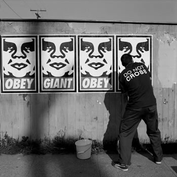 Caught between Andy Warhol's vision of the commercial graphic and its influence, and Keith Haring's "paint it anywhere" graffiti, the graphics produced by Fairey and Subliminal are social commentaries on the American way of life and the advertisements that reinforce that lifestyle. "I started to see this interesting process, like why people are fascinated with various icons and how that relates to advertising and our being inundated with images all day and every day. Especially to have something be seen in a peculiar context like the corner of a stop sign and not have an explanation to it. Fairey seems particularly fascinated by the responses he gets from his graphic inventions. Because the obey giant has a Posse sticker has no actual meaning, the various reactions and interpretations of those who view it reflect their personality and the nature of their sensibility. Now that the Andre phenomenon has gone on for some six years, Fairey has come to take it all with a philosophical sense of humor and a wry assessment of human nature. The sticker itself is an odd object of art.