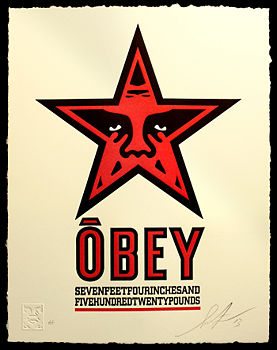 2 color Letterpress on 100% cotton Lettre paper, 110lb, deckled edges. Signed and numbered edition of 400. OBEY publishing chop on left corner. 10 inches x 13 inches, frame ready. Ships flat. $65