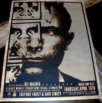 This print was issued as a promotional item for a gallery show featuring the work of Dave Kinsey and Shepard Fairey. It is not known if any copies of this print were issued signed and/or numbered. A variation of this print exists with a gold background.