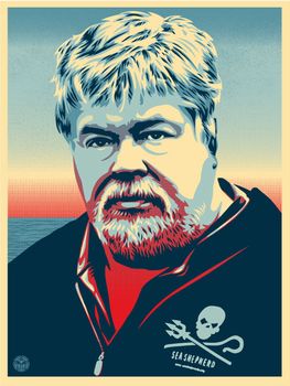 The mission of Sea Shepherd Conservation Society is to defend ocean wildlife worldwide. Shepard did a portrait of founder Paul Watson that will be available as a print on 12/17/09 at Random. The print comes in two different colorway, Light Blue and Dark Blue. Both are Editions of 450, 18 x 24, Signed and Numbered by Shepard and Capt. Paul Watson. $55 each. A portion of the profits will go to the Sea Shepherd Conservation Society. http://www.seashepherd.org/