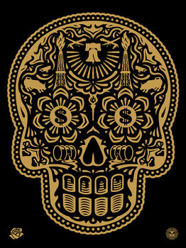The Power & Glory Day of the Dead Skull is my second collaboration with Ernesto Yerena on a Day of the Dead skull. Our first skull was more of a general homage to the Dia De Los Muertos style, but this one is more topical. If the idea of the Day of the Dead is to remember those souls who occupied the earth before us, then I can’t help but think about how those who come after us will remember us. Were we good stewards of the earth and the legacy of humanity? Ernesto and I have similar political views on war, greed, human rights, corruption, and the destruction of the planet, so we decided to make this skull about those subjects. I did a show exploring the dark sides of Power & Glory and this skull image is another cautionary call for us to think about our values and the legacy we will be remembered for. -Shepard