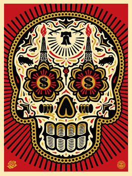 The Power & Glory Day of the Dead Skull is my second collaboration with Ernesto Yerena on a Day of the Dead skull. Our first skull was more of a general homage to the Dia De Los Muertos style, but this one is more topical. If the idea of the Day of the Dead is to remember those souls who occupied the earth before us, then I can’t help but think about how those who come after us will remember us. Were we good stewards of the earth and the legacy of humanity? Ernesto and I have similar political views on war, greed, human rights, corruption, and the destruction of the planet, so we decided to make this skull about those subjects. I did a show exploring the dark sides of Power & Glory and this skull image is another cautionary call for us to think about our values and the legacy we will be remembered for. -Shepard