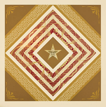 In ‘Power and Glory’ the richness of design is heightened by Fairey’s use, for the first time, of foil-blocking, a method whereby a metallic sheet is debossed onto the sheet of paper, using a metal etched plate, and printed after the silk screening process. The effect very cleverly mimicking the delicate design of scroll-work found on US monetary notes.