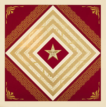 In ‘Power and Glory’ the richness of design is heightened by Fairey’s use, for the first time, of foil-blocking, a method whereby a metallic sheet is debossed onto the sheet of paper, using a metal etched plate, and printed after the silk screening process. The effect very cleverly mimicking the delicate design of scroll-work found on US monetary notes.