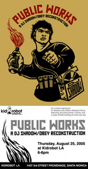 An additional, smaller-size print was also release to commemorate Public Works. Released as a limited edition of only 50 and apparently signed by both DJ Shadow and Shepard, this print featured the same graphic later used on Molotov Man. The small format print sold out at the grand opening of Public Works at Kidrobot LA on August 25, 2005.