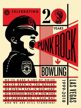 Punk Rock Bowling 20th. 18 x 24 inches. Screenprint on cream Speckle Tone paper. Signed by Shepard Fairey. Numbered edition of 500. $50. Available Tuesday, May 29 @ 10AM (PDT) on ObeyGiant.com in Store under Prints. Limit 1 per person/household.