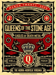 Shepard Fairey was one of the seven guest artists chosen by PNE to produce a Queens of the Stone Age show poster. Shepard's poster, Queens of the Stone Age, was produced for the March 20, 2005 show at the Nova in Norfolk, Virginia in a limited edition of 250 copies.