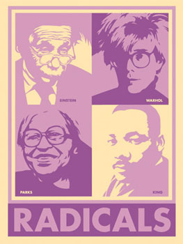I was asked to do some pro bono work for the Children’s Museum in San Diego, making decorations for the front windows. I decided I would make really colorful images of people who were controversial when they first became famous, yet now, in retrospect, have been accepted as positive contributors to society. They also share the common achievement of breaking down barriers and bridging racial, religious, artistic, and intellectual gaps. I chose these images because I feel like they’re really strong icons, and when parents bring their kids to the museum, the kids will say, “Mommy, Daddy: who is that?”