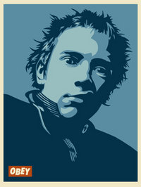 Two notable Stevenson photographs have made it into the Obey pantheon. His 1976 work "Soo Catwoman" became Shepard's 2002 Catwoman Swindle and his work entitled "Johnny Rotten, Dryden Chambers, 1976" became Shepard's 2002 Rotten Poster.