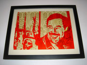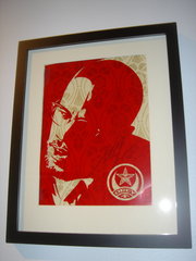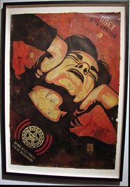 The exhibit, held at the Merry Karnowsky gallery on Beverly and La Brea, was called “Rise Above,” in reference to a Black Flag song. “Jealous cowards try to control… rise above, we’re gonna rise above.” The art was classic Fairey, a collection of striking, politically-charged collages in reds and blacks exploring the fine line between art, mass media and brainwashing. A number of portraits provided tender homage to some icons of our time - from Malcolm X (the largest and most expensive piece in the collection, priced at $7,500) to Steve Jones (the only piece which had NOT been sold when I checked).