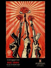 The title “Rise Above” is inspired by the lyrics of one of Shepard Fairey's favorite punk bands, Black Flag. “Jealous cowards try to control... rise above, we're gonna rise above.” Beyond just a Black Flag reference, "Rise Above" is both an attempt to reveal and skewer abuses of power, governmental hypocrisy, and loss of civil liberties, as well as a call for people to rise above these problems. Fairey's work encourages people who don't like the system to change it or work outside of it. Peace advocacy and the questioning of power and authority are dominant themes. Shepard Fairey's new body of work contains politically-charged screenprint, stencil, and collage mixed media pieces which use metaphor, humor, and seductive decorative elements to deliver provocative but beautiful results. These works blur the perceived barriers between propaganda and escapist decoration, political responsibility and humor with the intent of stimulating brain and heart/viscerally and intellectually.
