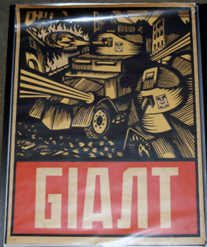 This is a variant of the postal paper variation of the print Tank. Unlike Tank Brown, the flames are not red on this print. The run size of 100 is the combined total for all variations, as the exact split between white and brown paper is unknown. Brown paper versions appear to be much more rare and only one copy of Tank Brown Variant is known to exist. The original rubylith for this print can be viewed here. Tank Brown, Tank Brown Variant and Soldier Star Brown are the only prints known at this time to have been issued on postal paper.