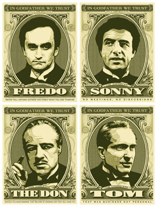 We are making an offer you can't refuse. Check these new prints inspired by the infamous Godfather Trilogy featuring The Don, Sonny, Tom, and Fredo. Sorry guys, Michael refused our sit down due to some business conflicts but the rest of the Corleone Family is present. We only have a very limited number of these prints so take care of business before it takes care of you! All prints are signed by Shepard Fairey.