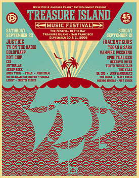 OBEY / GIANT artist Shepard Fairey created the poster design for the 2008 Treasure Island Music Festival. In addition, Fairey screen-printed a limited number of posters that were sold exclusively during the two-day music festival in September. These beautiful posters, all signed and numbered by Shepard Fairey, sold-out quickly. Although we were under the impression they were gone, we have had the fortune in discovering a secret stash (numbered 10 through 15) of them that we are offering for sale right now at the Noise Pop Shop. Print measures 18" x 24".