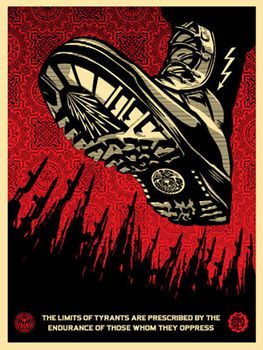 The Tyrant Boot print was inspired by the Frederick Douglas quote “The limits of tyrants are prescribed by the endurance of those whom they oppress”. Frederick Douglas, an African American, was a leader of the Abolitionist Movement. He was a firm believer in the equality of all people, whether black, woman, Native American, or recent immigrant. He was fond of saying, “I would unite with anybody to do right and with nobody to do wrong.” I felt that this print is appropriate for the situation my friend Revok is facing. Revok has been a major inspiration for me since I saw he and Saber’s huge pieces in the San Fran Bay area in the mid 90’s. I’ve never seen a Revok piece that did not enhance its surroundings. In July, the famed Los Angeles graffiti artist was arrested on felony vandalism charges. Indio police raided REVOK’s home, confiscating art supplies, cameras, hard drives, computers—essentially everything he uses to earn a living. This has crippled his entire business and destroyed his income. To add insult to injury, the felony charges are excessive and unjustified. REVOK is a celebrated artist who has dedicated his life to his work, not a criminal deserved of jail time. To fight these charges, REVOK will incur great legal expenses. If you would like to help, buy this print, or please visit www.revok1.com to see more of his work. All profit from the Tyrant Boot will go to Revok’s legal defense fund. Combat oppression, support and buy something.